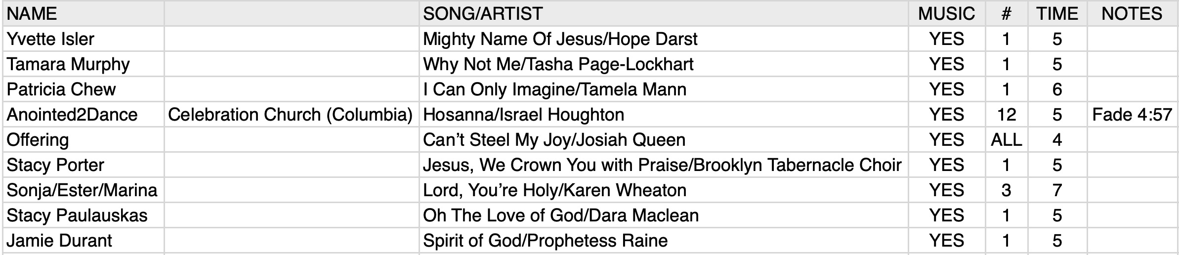 After the date 2 weeks before the event, the exact order of the songs will posted here. We can't wait to see what God has given you!